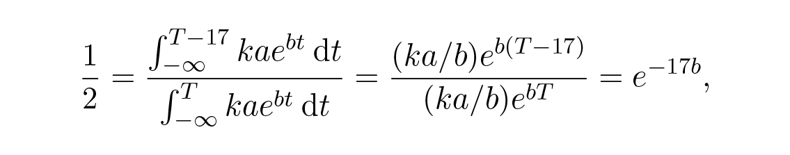 สรุป: and the amount of knowledge produced annually has a constant k of proportionality to the number of scientists alive. Assuming we begin at minus infinity in time (the error is small and you can adjust it to Newton’s time if you wish), we have the formula