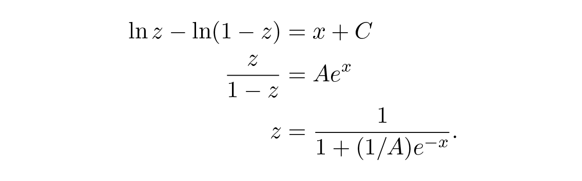 สรุป: A is, of course, determined by the initial conditions, where you put t (or x) = 0. You see immediately the S shape of the curve: at t = −∞, z = 0; at t = 0, z = A/(A + 1); and at t = + ∞, z = 1.