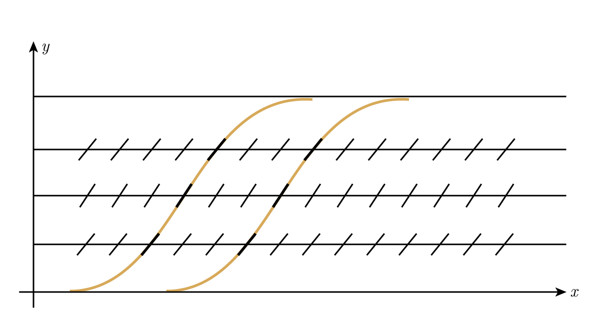 การสเก็ตช์ทิศทางสนาม (direction field), Figure 2.1, มักจะแสดงลักษณะของคำตอบและทำได้ง่ายโดยที่ความชันขึ้นอยู่กับ y เท่านั้น ไม่ขึ้นกับ x_—isoclines เป็นเส้นแนวนอน ดังนั้นรูปแบบของคำตอบจะเลื่อนไปตามแกน _x ได้โดยไม่เปลี่ยน “รูปร่าง” ของคำตอบ สำหรับค่า a และ b ที่กำหนด แล้ว there is really only one shape และเงื่อนไขเริ่มต้นกำหนดว่าคุณจะมองที่ไหน ไม่ใช่ว่าคุณจะมองอะไร เมื่อสมการเชิงอนุพันธ์มีสัมประสิทธิ์ที่ไม่ขึ้นกับตัวแปรอิสระ คุณจะเห็นผลแบบนี้