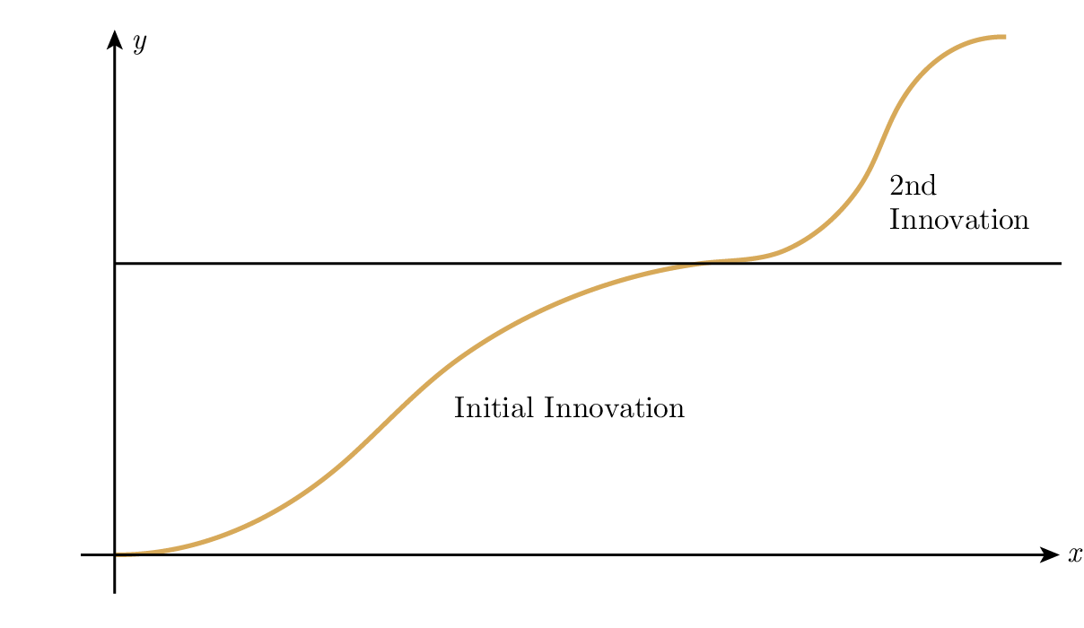 สรุป: Again we see how a simple model, while not very exact in detail, suggests the nature of the situation. Whether parallel processing fits into this picture or is an independent curve is not clear at this moment. Often a new innovation will set the growth of a field onto a new S curve which takes off from around the saturation level of the old one, Figure 2.2. You may want to explore models which do not have a hard upper saturation limit but rather finally grow logarithmically; they are sometimes more appropriate.