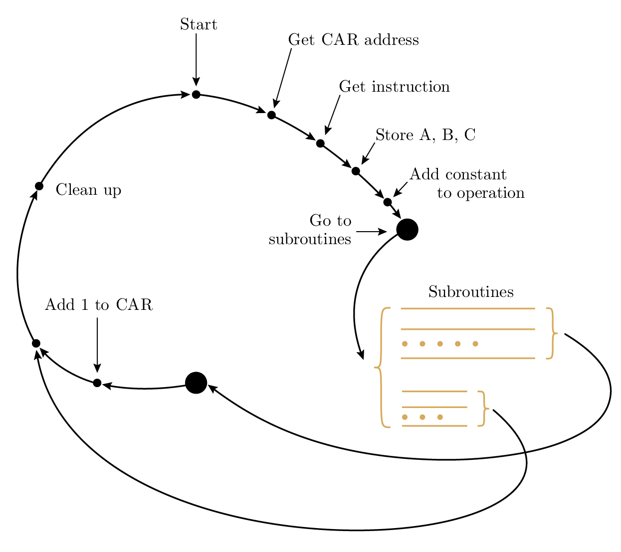 ทำอย่างไร? ง่ายมาก! ผมวาดลูปต่อไปนี้ในใจ (Figure 4.1). ก่อนอื่นเราต้องการ Current Address Register (car) ดังนั้นผมจึงมอบหนึ่งในรีจิสเตอร์ 2,000 ตัวของ IBM 650 ให้ทำหน้าที่นี้ แล้วเราเขียนโปรแกรมที่ทำสี่ขั้นตอนจากบทก่อน: (1) ใช้ car หาไปยังตำแหน่งของคำสั่งถัดไปของโปรแกรมที่คุณเขียน (แน่นอนว่าเขียนในภาษาของผม) (2) แยกคำสั่งนั้นออกและเก็บที่อยู่ทั้งสาม A, B, และ C ในตำแหน่งที่เหมาะสมในหน่วยความจำของ 650 (3) เพิ่มค่าคงที่ที่แน่นอนเข้าไปใน operation (op.) ของคำสั่งแล้วไปยังที่อยู่นั้น ที่นั่นสำหรับแต่ละคำสั่งจะมี subroutine ที่อธิบายการปฏิบัตินั้น คุณอาจคิดว่าผมมีเพียงสิบการปฏิบัติเท่านั้น แต่จริง ๆ แล้วยังมีเพียงสี่การปฏิบัติแบบสามที่อยู่—การบวก การลบ การคูณ และการหาร—ดังนั้นผมจึงใช้คำสั่ง 0 เพื่อหมายถึง “ไปที่ที่อยู่ B แล้วค้นหารายละเอียดเพิ่มเติมที่ต้องการ” แต่ละ subroutine เมื่อเสร็จแล้วจะโอนการควบคุมไปยังตำแหน่งหนึ่งในลูป (4) จากนั้นเราเพิ่ม 1 ไปยังเนื้อหาในรีจิสเตอร์ car ปรับแต่งรายละเอียดบางอย่าง แล้วเริ่มใหม่ เช่นเดียวกับการทำงานภายในของเครื่องเดิม แน่นอนคำสั่งโอน ทั้งเจ็ดคำสั่งอย่างที่ผมจำได้ ล้วนใส่ที่อยู่ลงใน car และโอนไปยังจุดในลูปหลังการเพิ่ม 1 ให้กับ car