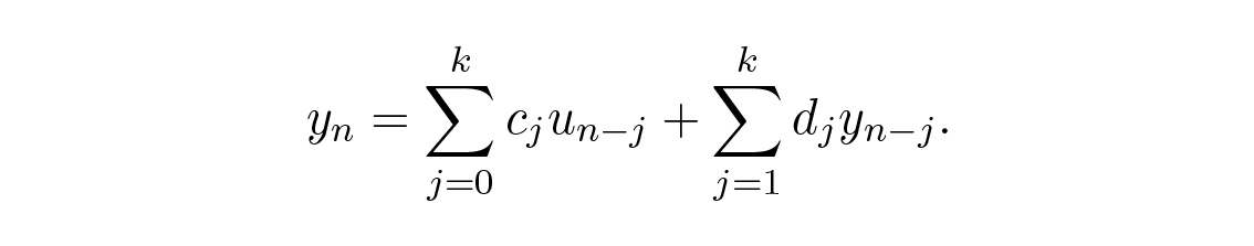 สรุป: From this formula it will be seen we have values on only one side of the current value n, and we use both old and current signal values, _u_n, and old values of the outputs, _y_n. This is classical, and arises because we are often processing a signal in real time and do not have access to future values of the signal.