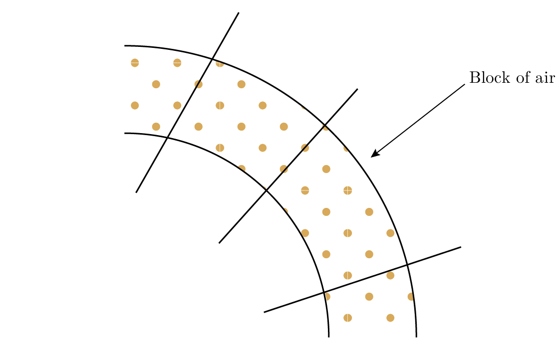 สรุป: A very similar simulation to the atomic bomb arises in weather prediction. There the atmosphere is broken up into large blocks of air, and the relevant conditions for cloud cover, albedo, temperature, pressure, moisture, velocity, etc. must be initially assigned to each block, Figure 18.2. Then using conventional physics for the atmosphere, we trace where each block goes in a short time interval, along with the relevant changes. It is the same kind of step-by-step evolution as before.