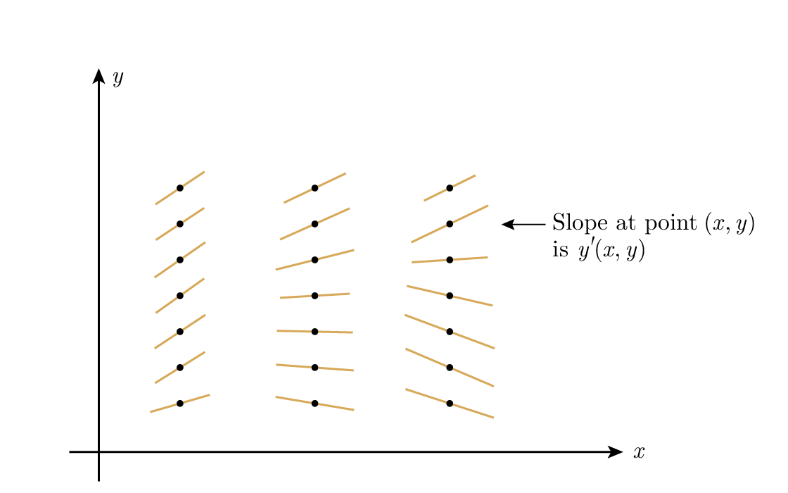 คุณคงจำได้ว่า สนามทิศทาง คือการวาดองค์ประกอบเส้นที่มีความชันตามสมการเชิงอนุพันธ์ในแต่ละจุดบนระนาบ xy (ระนาบ x–y) โดยอ้างอิงความชันจากสมการนั้น ๆ, Figure 20.1 ตัวอย่างเช่น สมการเชิงอนุพันธ์