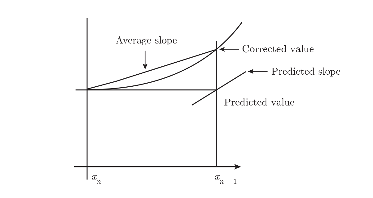 สรุป: How do we numerically solve a differential equation? Starting with only one first-order linear ordinary differential equation, we imagine the direction field. Our problem is from the initial value, which we are given, we want to get to the next nearby point. If we take the local slope from the differential equation and move a small step forward along the tangent line, then we will make a only small error, Figure 20.4. Using that point we go to the next point, but as you see from the figure we gradually depart from the true curve because we are always using “the slope that was,” and not a typical slope in the interval. To avoid this we “predict” a value, use that value to evaluate the slope there (using the differential equation), and then use the average slope of both ends to estimate the average slope to use for the interval, Figure 20.5. Then, using this average slope, we move the step forward again, this time using a “corrector” formula. If the predicted and corrected values are “close” then we assume we are accurate enough, but if they are far apart then we must shorten the step size. If the difference is too small, then we should increase the step size. Thus the traditional predictor-corrector methods have built into them an automatic mechanism for checking the step-by-step error—but this step-by-step error is, of course, not the whole accumulated error by any means! The accumulated error clearly depends on the convergence or divergence of the direction field.