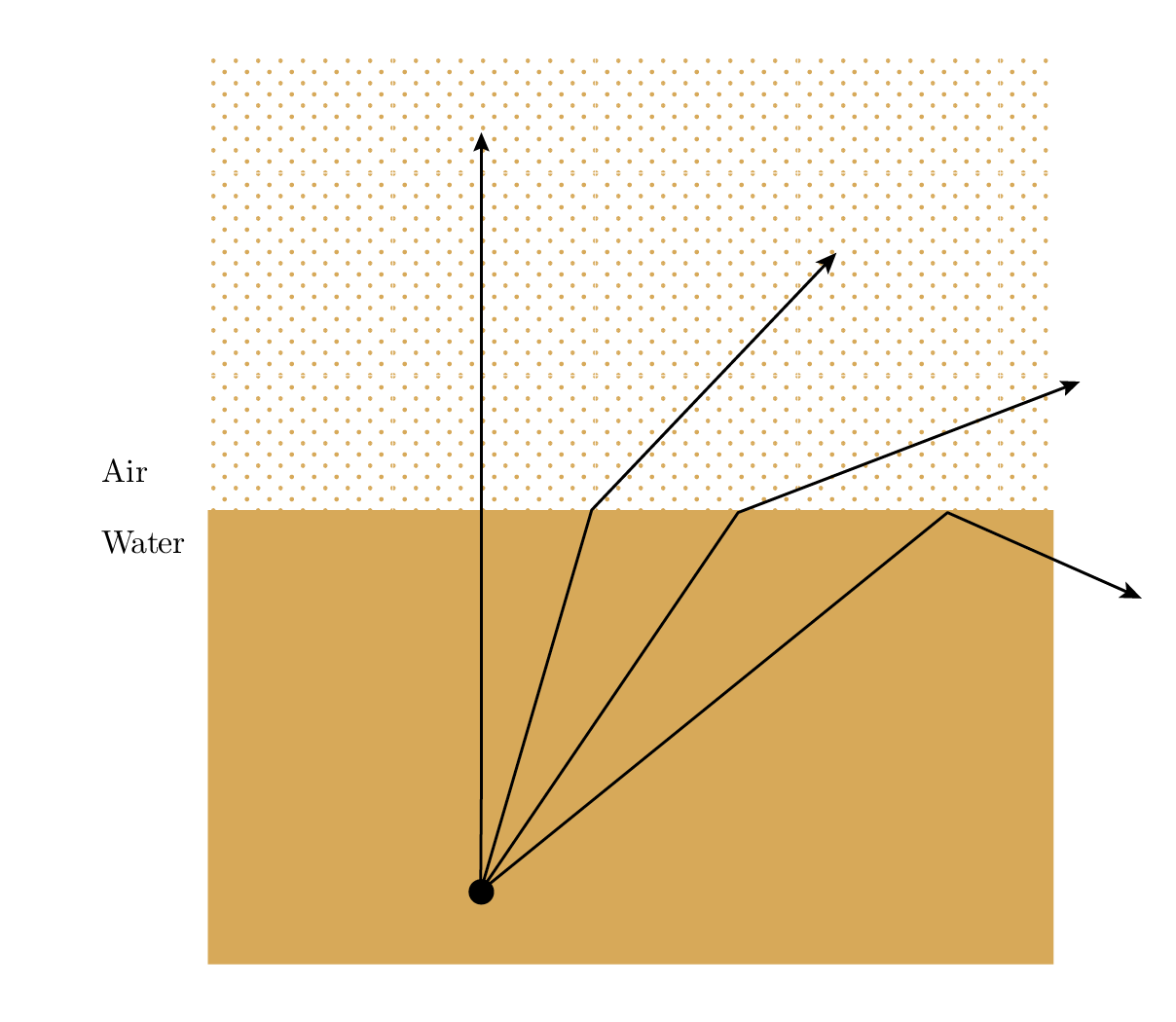 สรุป: When I first heard of a seminar on the topic of fiber optics at Bell Telephone Laboratories, I considered whether I should attend or not—after all, one must try to do one’s own work and not spend all one’s time in lectures. First, I reflected that optical frequencies were very much higher than the electrical ones in use at time, and hence the fiber optics would have much greater bandwidth—and bandwidth is the effective rate (bits per second) of transmission, and is the name of the game for the telephone company, my employers at the time. Second, I recalled that Alexander Graham Bell had once sent a telephone conversation over a light beam—but then he was a bit of a gadgeteer all his life. So it could be done, and had been done long ago. Third, I also knew about the internal reflections as you go from a higher-index medium to a lower-index medium—you see it in still water when viewed from below, where there are angles which totally reflect the light back down into the water, Figure 21.1. Hence I understood, in a fair way, what an optical fiber would be—they were a novel idea then. I certainly had enough experience in college labs with drawing glass into fibers to understand how easy it would be, due to the effects of surface tension, to make round fibers of a fairly uniform diameter, and to some extent the corresponding role of surface tension for liquid glass. Hence I took the time to go and learn about this promising new development.