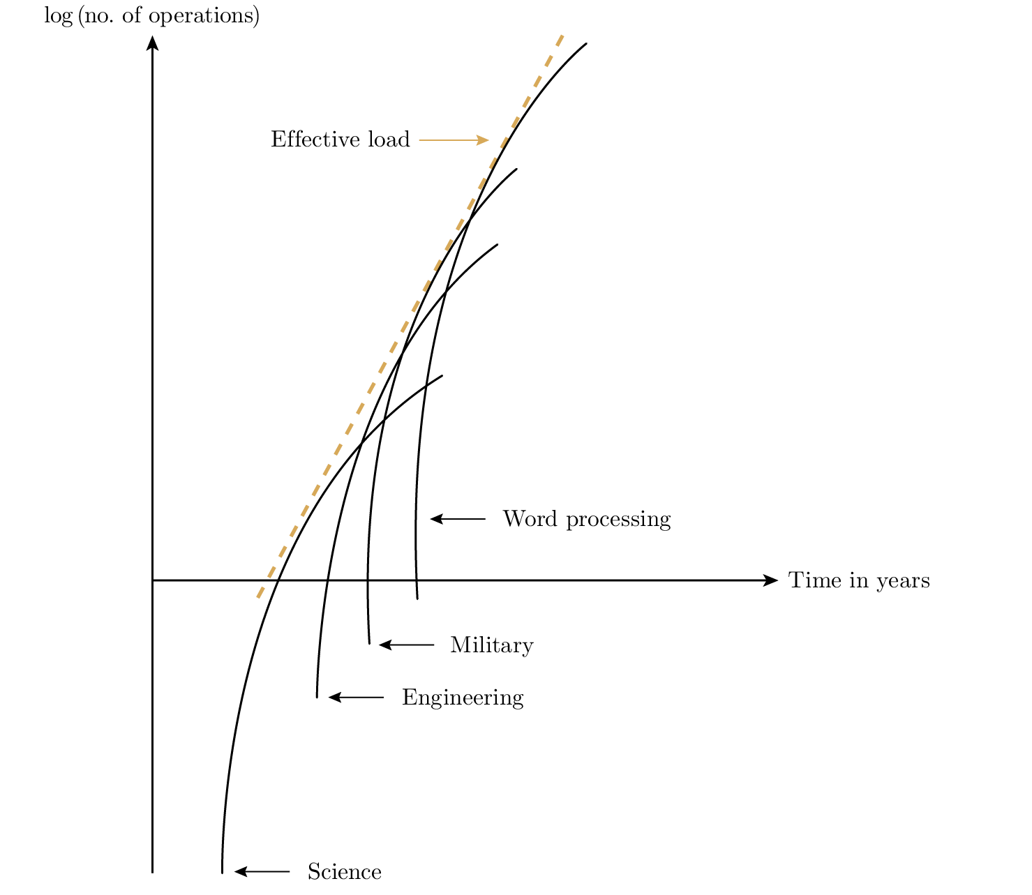 งานคำนวณด้านวิศวกรรมก็เกิดขึ้นตามมา และมีรูปร่างการเติบโตคล้ายกัน แต่มากกว่าและทับซ้อนอยู่บนโค้งวิทยาศาสตร์เดิม ต่อมา อย่างน้อยที่ Bell Telephone Laboratories ผมพบงานทางทหารที่มีปริมาณมากกว่า และท้ายที่สุดเมื่อเราหันไปสู่การจัดการสัญลักษณ์ในรูปแบบของ word processing เวลาในการคอมไพล์สำหรับภาษาระดับสูง และงานอื่นๆ ก็เพิ่มขึ้นเช่นกัน ดังนั้นแม้แต่ละประเภทงานจะดูเหมือนเข้าใกล้จุดอิ่มตัวในเวลาของมัน ผลรวมของทั้งหมดกลับทำให้เกิดอัตราการเติบโตที่ค่อนข้างคงที่