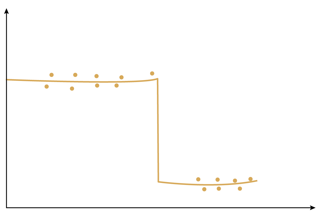 แล้วฟิลเตอร์ไม่เชิงเส้นล่ะ? ความเป็นไปได้มีมากมาย และแน่นอนต้องขึ้นกับปัญหาเฉพาะที่คุณมี ผมจะพูดเพียงอย่างเดียว คือ running median filter เมื่อให้ชุดข้อมูลหนึ่ง คุณคำนวณค่า median เคลื่อนที่เป็นผลลัพธ์ ลองพิจารณามันในทางปฏิบัติ ก่อนอื่นคุณจะเห็นว่ามันมีแนวโน้มจะทำให้สัญญาณรบกวนท้องถิ่นเรียบ—median จะใกล้เคียงกับค่าเฉลี่ย ซึ่งเป็นการปรับเชิงเส้นแบบ least-squares ใช้สำหรับการทำ smoothing ท้องถิ่น แต่เมื่อเกิด discontinuity, Figure 17.2, สมมติว่ามีเส้นระดับราบหนึ่งแล้วลดลงไปสู่เส้นระดับราบอีกอัน ฟิลเตอร์จะทำอย่างไร? ถ้ามีจำนวนสมาชิกเป็นคี่ใน median filter คุณจะเห็นว่าเอาต์พุตจะยังคงอยู่ที่ระดับบนจนกว่าคุณจะมีจุดมากกว่าครึ่งหนึ่งอยู่ที่ระดับล่าง แล้วมันจะ jump ไปที่ระดับล่าง มันจะตาม discontinuity ได้ค่อนข้างดี และจะไม่พยายามทำให้มันเรียบไปทั้งหมด! ในบางสถานการณ์นั่นคือการกรองที่คุณต้องการ กำจัดสัญญาณรบกวนท้องถิ่น แต่ไม่สูญเสียการเปลี่ยนแปลงฉับพลันในสภาพของระบบที่กำลังศึกษา