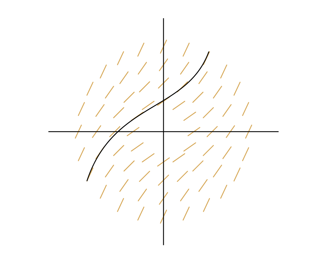 คุณคงจำได้ว่า สนามทิศทาง คือการวาดองค์ประกอบเส้นที่มีความชันตามสมการเชิงอนุพันธ์ในแต่ละจุดบนระนาบ xy (ระนาบ x–y) โดยอ้างอิงความชันจากสมการนั้น ๆ, Figure 20.1 ตัวอย่างเช่น สมการเชิงอนุพันธ์
