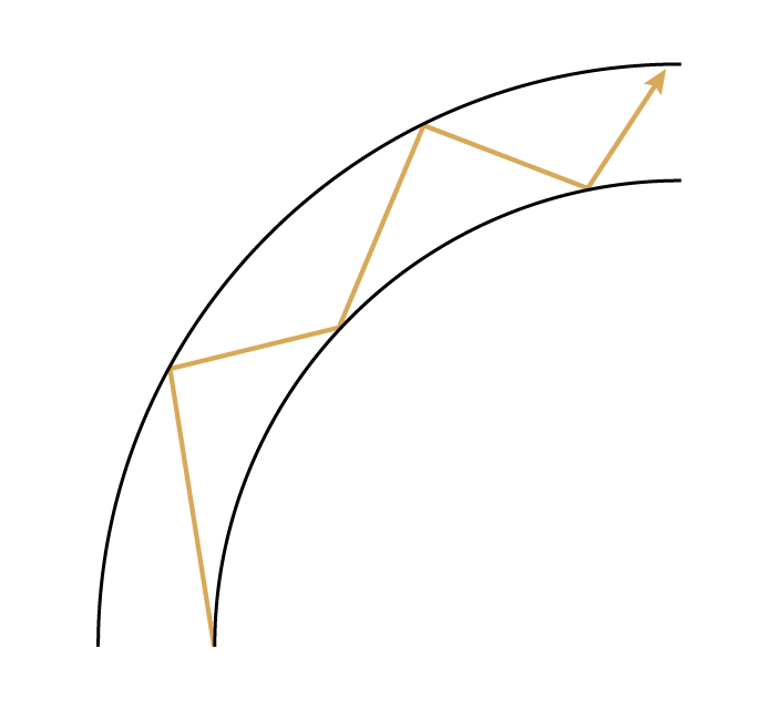 ต่อมาผมได้ยินแนวคิดที่ว่าไม่ใช่มีเพียงชั้นเดียว แต่เป็นการเปลี่ยนดัชนีหักเหอย่างค่อยเป็นค่อยไป (smoothly graded change) และผมก็สังเกตว่านี่เป็นสิ่งเดียวกับแนวทาง strong focusing ที่ถูกพัฒนามาก่อนหน้านั้นสำหรับ cyclotrons การไล่ดัชนีสามารถทำได้ทั้งโดยการทำเคมีหรือการรักษาด้วยรังสี แทนที่จะให้เกิดการสะท้อนอย่างเฉียบพลัน เราสามารถใช้การโค้งงออย่างค่อยเป็นค่อยไปของรังสีให้กลับเข้าสู่ศูนย์กลางเมื่อมันเคลื่อนออกจากกลางของเส้นใย Figure 21.3